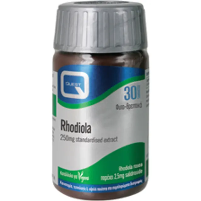 Το τυποποιημένο εκχύλισμα ρίζας Rhodiola 250mg (χρυσή ρίζα) της Quest αποδίδει 2,5mg salidroside, που είναι το αναγνωρισμένο ενεργό συστατικό αυτού του παραδοσιακά χρησιμοποιούμενου βοτάνου. Η Rhodiola είναι ένα βότανο που θεωρείται ότι ενισχύει την πνευματική και φυσική απόδοση και ελαττώνει την πνευματική κόπωση, διατηρώντας τα επίπεδα της ενέργειας υψηλά. Επίσης, παρέχει σημαντική βοήθεια στην καταπολέμηση του άγχους, βοηθά στην αντιμετώπιση συμπτωμάτων που σχετίζονται με τη νευρικότητα όπως η δυσκολία στον ύπνο, η μειωμένη όρεξη, η οξυθυμία, η υπερένταση, οι πονοκέφαλοι και η κόπωση.