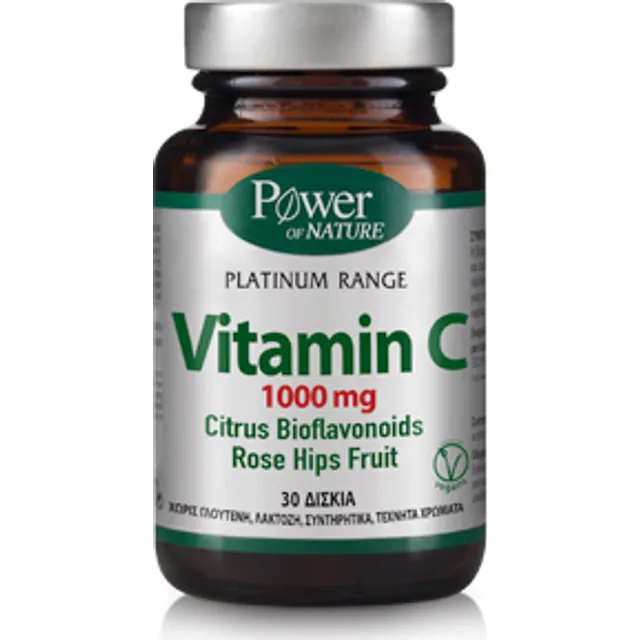Το Power of Nature Platinum Range Vitamin C 1000 mg Citrus Bioflavonoids Rose Hips Fruit είναι ένα συμπλήρωμα διατροφής με βιταμίνη C, βιοφλαβονοειδή εσπεριδοειδών και καρπό αγριοτριανταφυλλιάς.