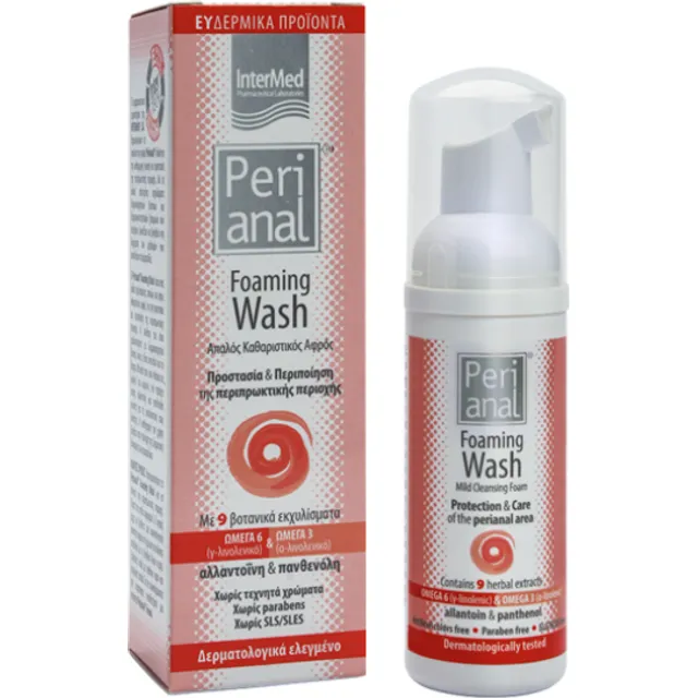 Το Perianal Foaming Wash, με βάση τα απαραίτητα Ω3 και Ω6 λιπαρά οξέα, 6 εκχυλίσματα και 3 έλαια από δερμοκοσμητικά βότανα όπως βοραγίνο, αγριοτριανταφυλλιά, αλόη, χαμομήλι, αμαμελίδα, φασκόμηλο, με αλλαντοϊνη & πανθενόλη, είναι ένας ειδικά σχεδιασμένος, απαλός, ήπιος καθαριστικός αφρός για την προστασία και περιποίηση της περιπρωκτικής περιοχής ιδιαίτερα όταν υπάρχουν καταστάσεις αιμορροϊδοπάθειας.