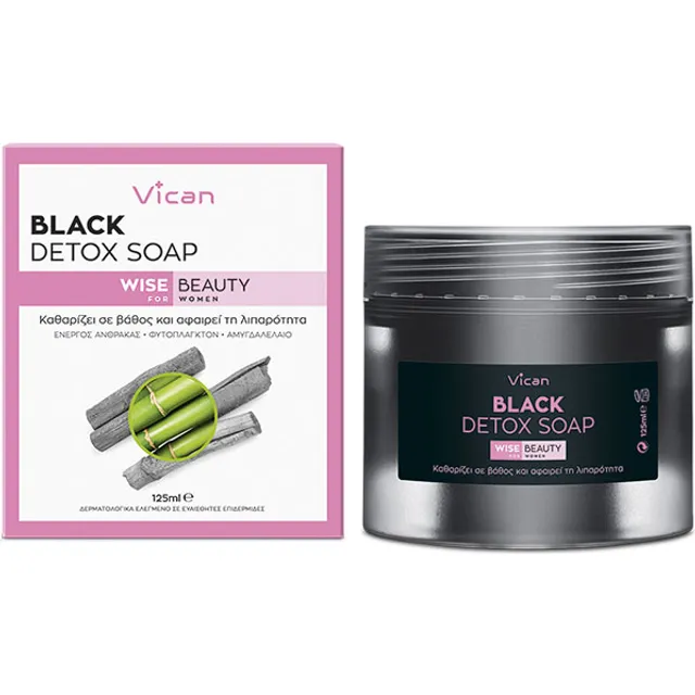 Το black detox soap της WISE BEAUTY από τη vican προσφέρει έναν βαθύ καθαρισμό, απομακρύνοντας τους ρύπους της καθημερινότητας από το πρόσωπο. Η σύνθεση του με ενεργό άνθρακα, φυτοπλαγκτόν και πολύτιμα έλαια αποτοξινώνει την επιδερμίδα χωρίς να την ξηραίνει.