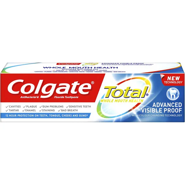 - Η οδοντόκρεμα Colgate Total® Advanced Visible Proof παρέχει άριστη προστασία ενάντια σε πλάκα και ουλίτιδα, ενώ ταυτόχρονα βοηθά στην καταπολέμηση των βακτηρίων, της δυσάρεστης αναπνοής, της διάβρωσης του σμάλτου, της υπερευαισθησίας, της τερηδόνας, της πέτρας και της δημιουργίας λεκέδων