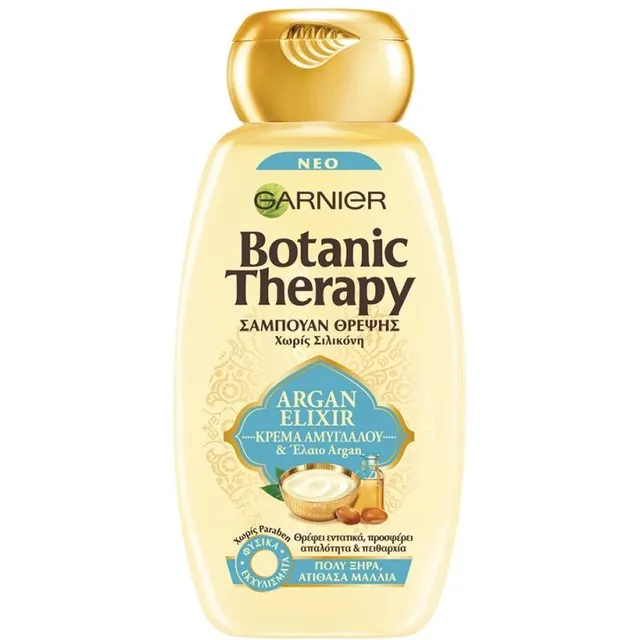 Botanic Therapy Argan Elixir Shampoo 400ml. Ανακαλύψτε τη νέα αυθεντική συνταγή πλούσιας θρέψης για πολύ ξηρά και ατίθασα μαλλιά, που αποτελείται από έλαιο argan, γνωστό για τις θρεπτικές του ιδιότητες και κρέμα αμυγδάλου, επιλεγμένη για την πλούσια και κρεμώδη υφή της. Αποτέλεσμα: Εντατικά θρεμμένα, τα μαλλιά γίνονται απαλά και πιο ελαστικά, πραγματικά πιο ευκολοχτένιστα. Λάμπουν από ομορφιά.