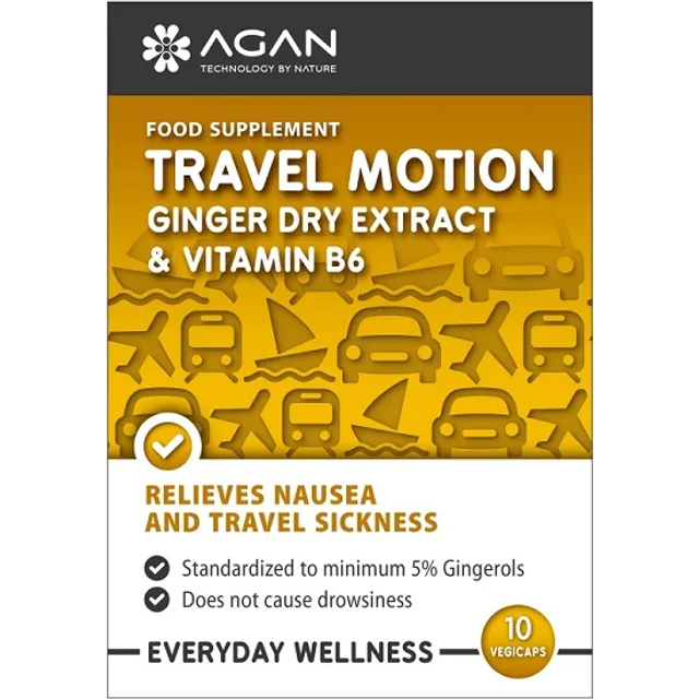 Το Travel motion περιέχει σκόνη ρίζας τζίντζερ με τιτλοδότηση 5% σε τζιντζερόλες (25 mg τζιντζερόλες ανά φυτική κάψουλα) και ακόμη, βιταμίνη Β6 η οποία συμβάλλει:
